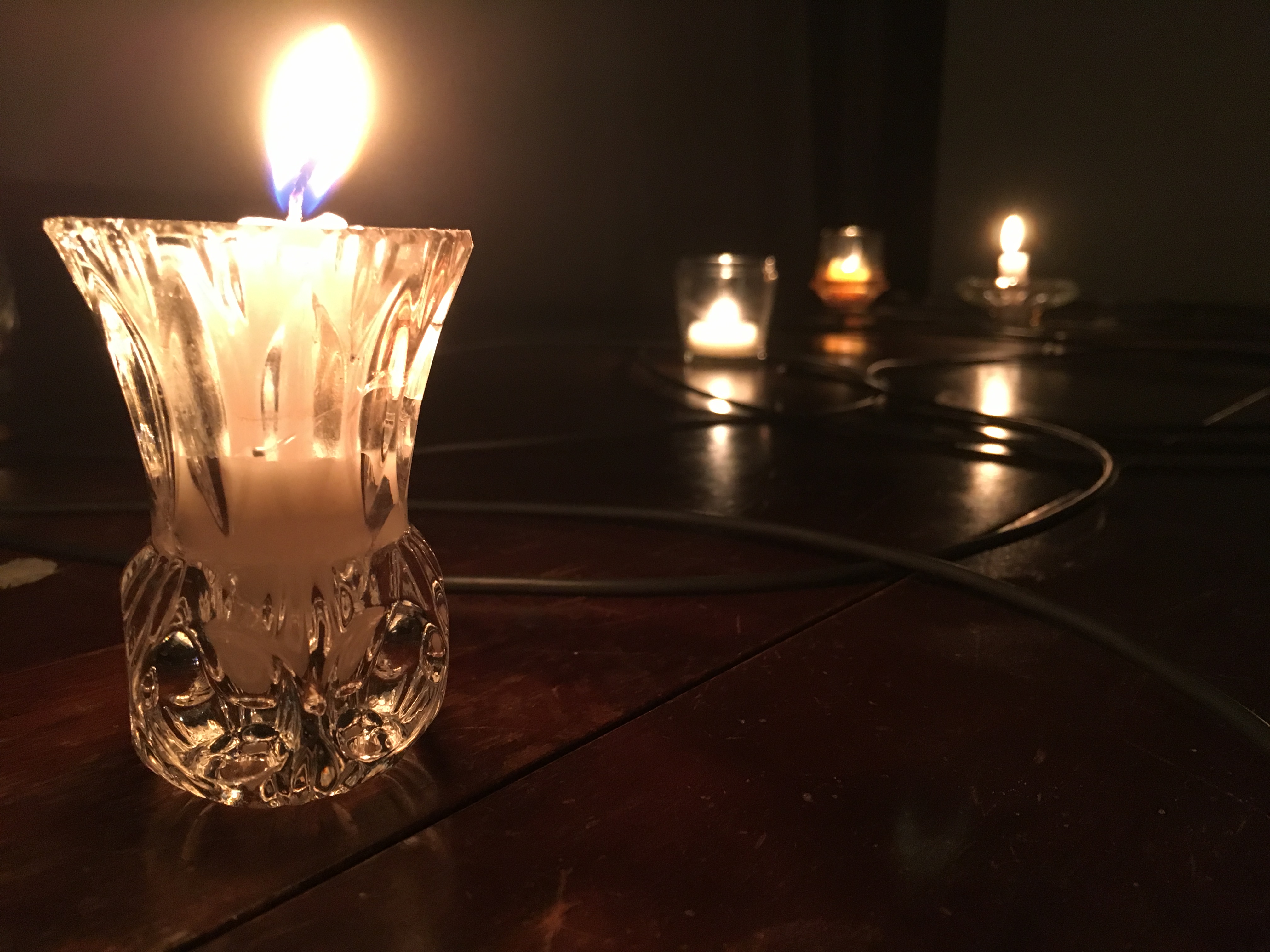 Candle flames emit strong light comparing to electric lights, and the dancing motion of the flames are both visible and audible in this piece. I make compositional decisions by considering the light intensities and movements of different candles to place them to create a desired yet autonomous sound environment. The length, thickness, and kinds of candles as well as kinds of candle holders used for the instrument all change the property of the sounds and affect the performance. The heat, melting wax, and smoke coming from candles influence how I perform the piece.